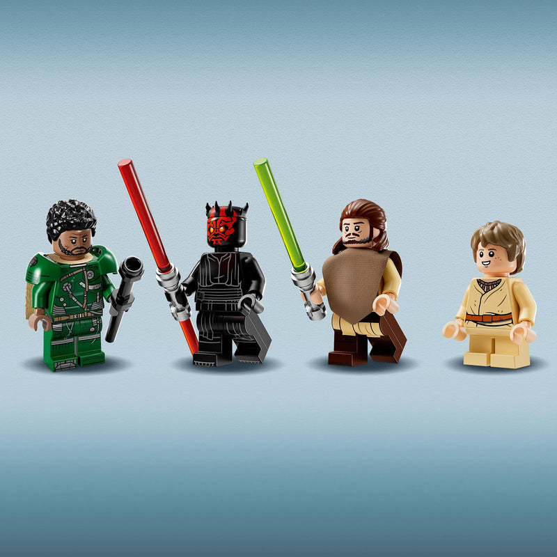 - 4 LEGO® Star Wars™ minifiguren: Darth Maul met zijn dubbelzijdige lichtzwaard, Qui-Gon Jinn, een Bothan Spion en een LEGO® Star Wars™ 25th Anniversary minifiguur.