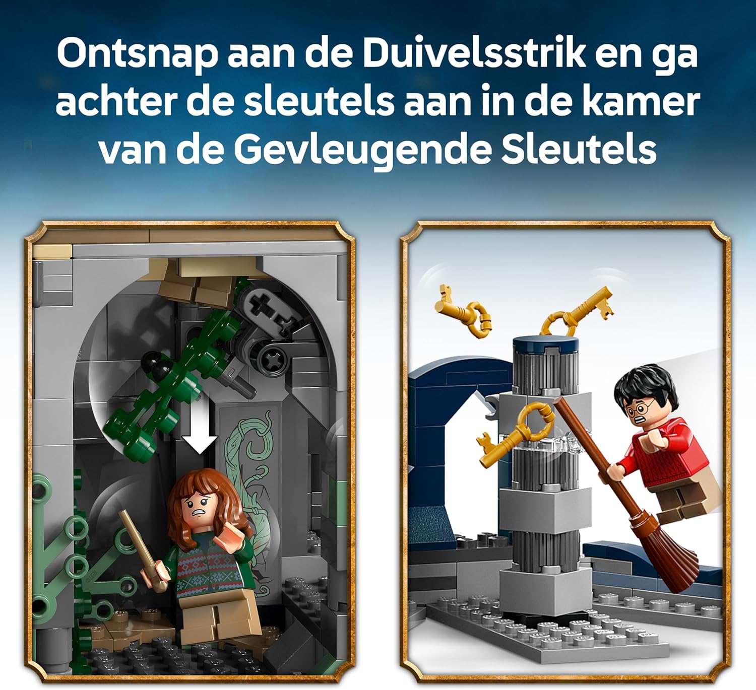 - Authentieke details uit de Harry Potter films – ontdek een valluik om uit Pluisjes kamer te ontsnappen, werkende Duivelsstrik, vliegende sleutels-functie, draaibare Grote Trap naar het kantoor van Perkamentus, de Spiegel van Neregeb en meer