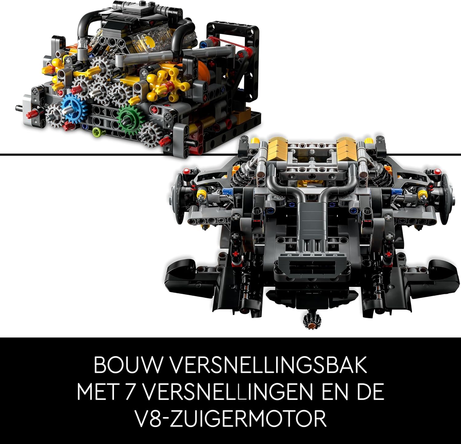 - Bouw de V8-zuigermotor en meer – geniet van tijd voor jezelf terwijl je elk detail in elkaar zet, waaronder de versnellingsbak met 7 versnellingen en schakeltrommel, de deuren die open kunnen, de verstelbare achtervleugel en de V8-zuigermotor